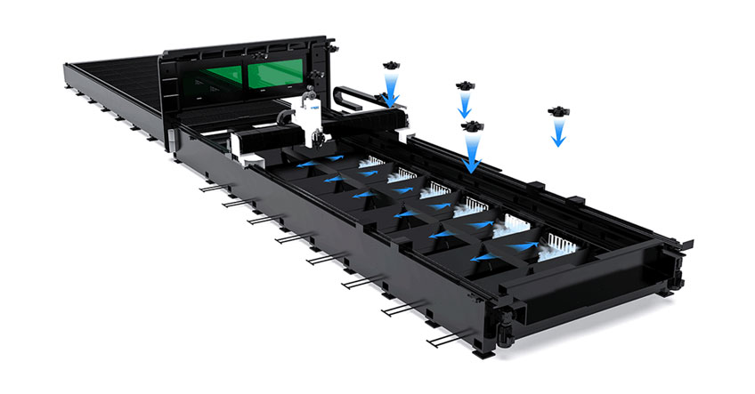 床身每段設有排煙裝置 隨動精準排煙,軸流風機包圍式向下排煙360°強攏吸附,