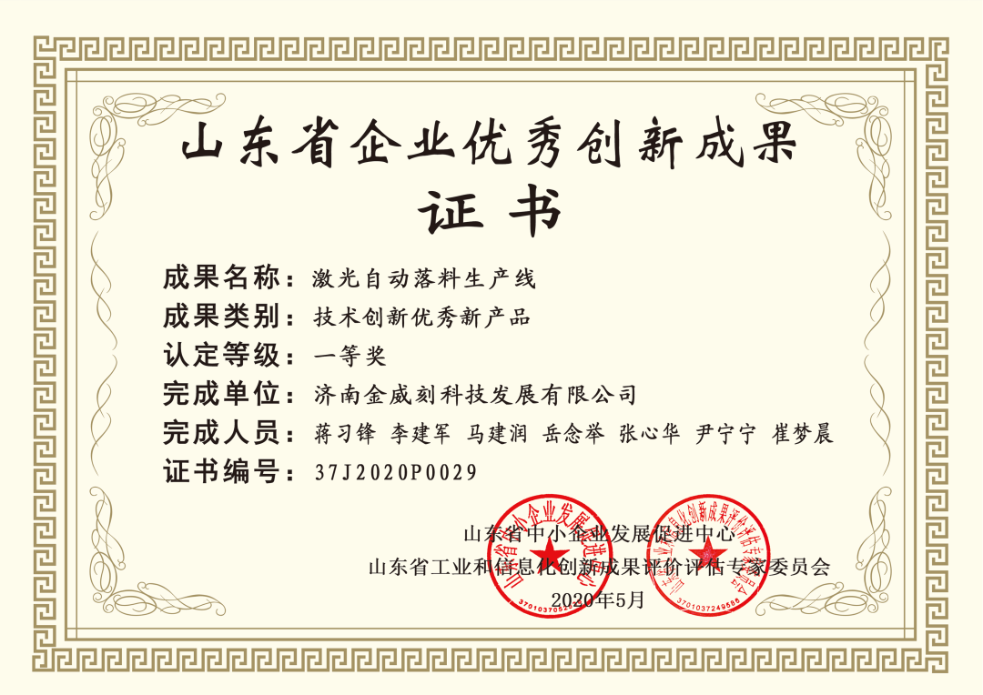 值得一提的是,由金威刻激光自主研發的激光切割智能生產線項目持續斬獲榮耀與關注。2020年,山東省工信部公示了第五批山東省制造業單項冠軍名單,金威刻激光憑借該項目的領先優勢,獲評“第五批山東省制造業單項冠軍企業”。